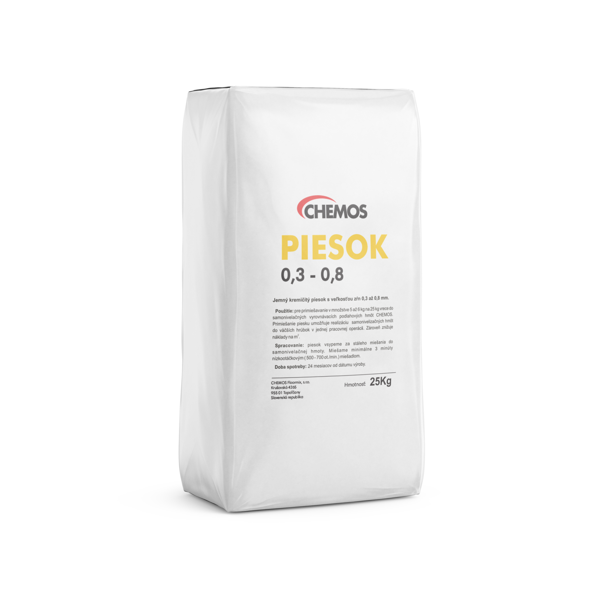 Použitie: Kremičitý piesok pre primiešavanie v množstve 5 až 8 kg na 25 kg vrece do samonivelačných vyrovnávacích podlahových hmôt CHEMOS. Primiešanie piesku umožňuje realizáciu samonivelizačných hmôt do väčších hrúbok v jednej pracovnej operácii. Zároveň znižuje náklady na m2.